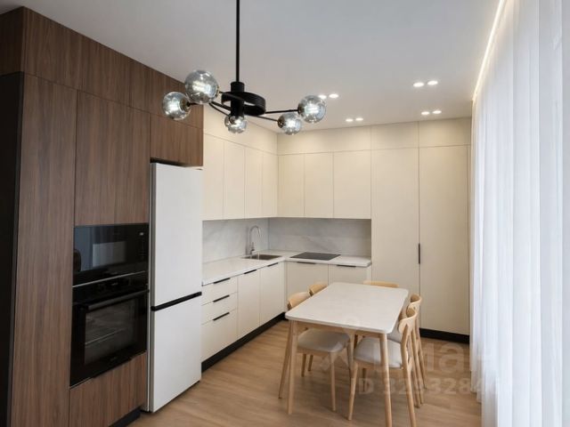 Квартира оснащена дизайнерской заказной мебелью и качественной бытовой техникой.