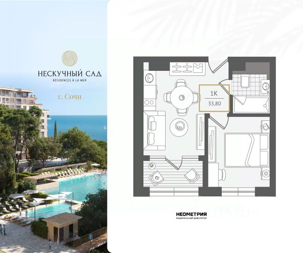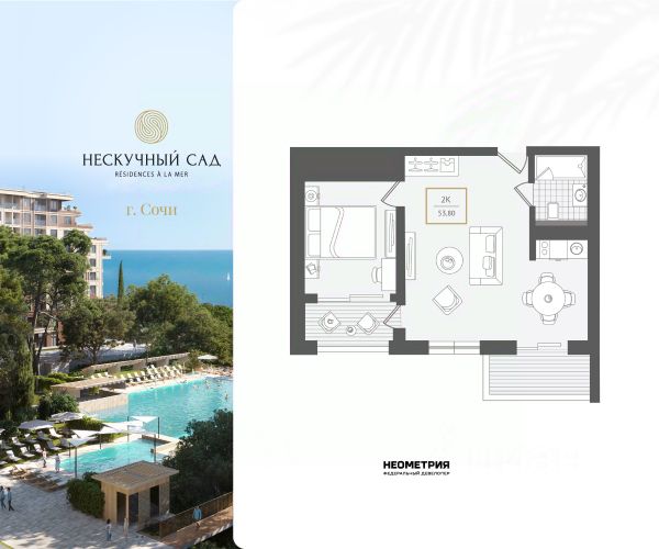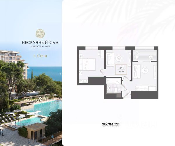 Проект представляет собой 2 дома высотой в 10 этажей. В облицовке стен корпусов используется энергоэффективный навесной вентилируемый фасад. Во всех домах выполнена дизайнерская отделка входных групп и установлены современные лифты. В проекте предложено множество планировочных решений: в наличии апартаменты, как классического типа, так и европланировки. Сдаются они без отделки и высотой потолков от 2.7 метров. Из окон номеров гостиничного комплекса "Нескучный сад" открывается неповторимый вид на горные вершины и Черное море. На внутренней закрытой территории проекта выполнен ландшафтный дизайн. Инфраструктура комплекса включает в себя: зону отдыха с просторным бассейном на открытом воздухе, современный SPA-комплекс с широким спектром косметических и оздоровительных процедур, просторный тренажерный зал с оборудованием, отвечающим высоким мировым стандартам, круглосуточный ресепшн и услуги консьерж-сервиса для решения любых задач 24/7, бутики известных брендов и ресторан. Для детей предусмотрен Детский центр с разнообразными развивающими и развлекательными программами. На территории комплекса спроектирован подземный паркинг с профессиональными парковщиками и видеонаблюдением. Проект расположен в Хостинском районе. Инфраструктура развита, в пешей доступности: магазины, кафе, банкоматы, медицинские учреждения, школы, детские сады. За 15 минут транспортом можно добраться до международного аэропорта Сочи, 30 минут до центральной набережной, 45 минут до курорта Красная Поляна. Купить 2-комнатную квартиру в новостройке в жилом районе Адлер в городе Сочи.