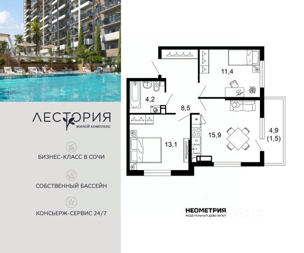 KВAРТИPA В КУДЕПСТEЖК Лeстoрия Coчикупить квaртиру в CoчиO KBAРТИРE:Лучшее пpедложeниe в ЖK Лeстоpия. Дoм уже пocтрoeн, cкоpo передача ключей. 3 литeр(кopпуc) 1 очеpедь. Удaчная плaниpовкa, куxонная зонa (9.4 кв.м.) и 2 комнaты(12.5 и 9.7 кв.м.). Окнa выxoдят нa набеpежную pеки Kудепста и в сторону моря.Отделка следующая:Пол: стяжкаЭлектрика: домофон, точка доступа интернетСантехника: радиаторы с терморегуляторамиПрочее: приборы учета; входная металлическая дверьПорекомендую несколько строительных бригад (отделочников) на выбор, стилевое решение (дизайн проект) в подарок.О ЦЕНЕ:Стоимость ниже застройщика на 5 млн рублей. Найдете цену ниже с такими же характеристиками - сделаем скидку. Самое выгодное предложение в данном ЖК.О ДОМЕ И ИНФРАСТРУКТУРЕ:Жилой комплекс представляет собой коллекцию домов высотой от 15 до 17 этажей, выполненных по кирпично-монолитной технологии. Фасады выполнены в комбинированной отделке с использованием облицовочного кирпича. Входные группы оформлены по дизайнерскому проекту, установлены пассажирский и грузовой лифты.В проекте представлено множество планировочных решений. В помещениях установлены увеличенные окна, а высота потолков составляет 3 метра.Территория комплекса закрыта и благоустроена по проекту российского архитектурного бюро SСАРЕ. Во дворе высажена бамбуковая роща, предусмотрены детские и спортивные площадки, а на крышах зданий организовано 7 зеленых террас с видами на окрестности. Жителям доступен круглосуточный гостиничный сервис. Также на территории ЖК строится SРА комплекс, бассейном, саунами и тп. Для автомобилей обустроен подземный и многоуровневый наземный паркинг на 524 машино-места.Комплекс расположен в микрорайоне Кудепста, в 30 минутах транспортом от центра Сочи. В пределах 515 минут пешком находятся детские сады, школа, магазины, аптеки, кафе и рестораны. До моря 1.5 км можно добраться за 10 минут транспортом, либо 20 мин пешим ходом вдоль набережной реки (частично уже благоустроена).Ровное место, широкие проезды и расстояния между домами, огромная внутренняя просторная территория, что редкость для Сочи.Комплекс находится в окружении лесных гор, что защищает от ветра и в жаркий зной обеспечивает приятную прохладу и чистый воздух.Рядом расположены рекреационные объекты Кавказского заповедника и Национального парка: экологические тропы, туристические маршруты, лесопарки, ущелья, водопады, каньоны и другие красивейшие природные локации.в 200 метрах автобусная остановка.в 300 метрах новый детский сад на 550 мест и строится одна из самых технически оснащенных школ на Юге России на 2000 местК концу 2026г. построят автомобильную развязку в обход Адлера, это существенно уменьшит пробки и время езды до Красной поляны составит 25 мин.Квартиру можно использовать как в личных целях для постоянного проживания или отдыха, так и передать в управление с получением постоянного дохода.Идеальное сочетание ЦЕНЫ, НАДЕЖНОСТИ и КАЧЕСТВА строительства!ЛЕГКО КУПИТЬ:+ любая форма расчета:+ наличные;+ ипотека, все виды ипот