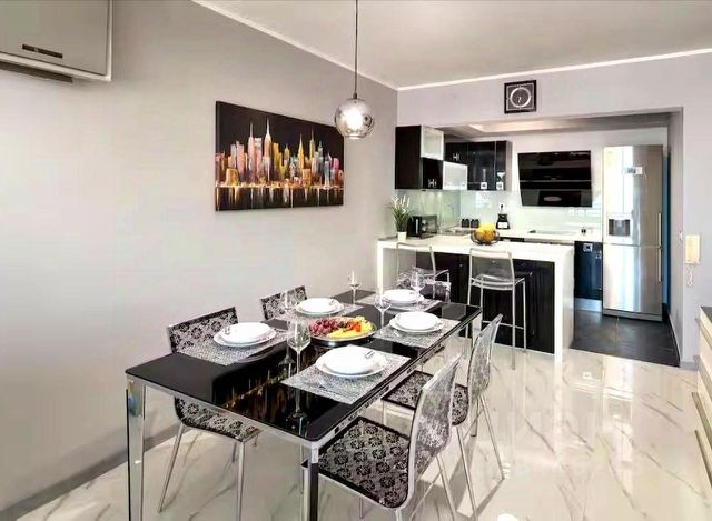 Квартира оснащена дизайнерской заказной мебелью и качественной бытовой техникой.
