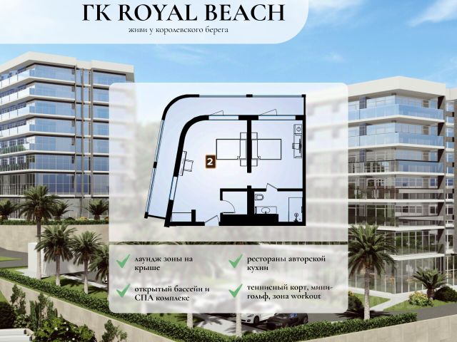 ROYAL BEACH SOCHI для жизни или инвестиций. В комплексе доступны резиденции для постоянного проживания или номера в отеле 5* под управлением международного оператора, площадью от 52 до 148 кв метров. ROYAL BEACH SOCHI расположен на впечатляющей территории 10 Гектаров, где имеется вся необходимая инфраструктура. Для отдыха: Масштабная SPA-зоны Лаунж-зоны на крыше Каток Музей винного дела Компьютерный клуб Концертный театр Кинотеатр Рестораны авторской кухни Кафе и кондитерские Музей арт-обьектов Залы для боулинга Бильярдные Спорт и оздоровление: Теннисные корты Поля для мини-гольфа Work out площадка Терренкур Открытый бассейн Спорткомплекс Медицинский центр Для детей: Веревочный парк Батутный комплекс Тематический парк Игровые зоны Детский центр для проведения мастер-классов Деловая среда: Коворкинг-зона Выставочный конгресс - центр Конгресс-холл для совещаний