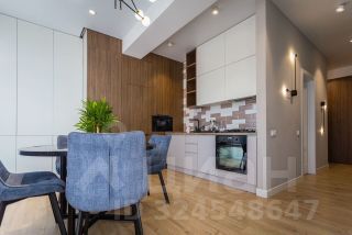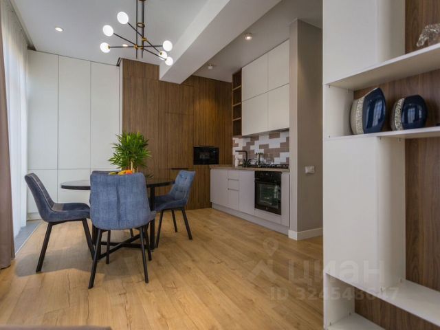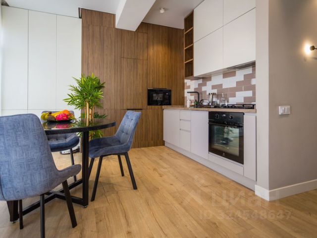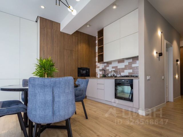 Кухня полностью укомплектована всей необходимой техникой: посудомоечной машиной, двухконфорочной плитой, микроволновой печью, духовым шкафом и холодильником. В стильной ванной комнате обустроена душевая зона, установлена раковина с тумбой и встроенный шкаф для белья.