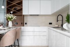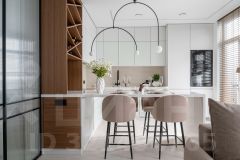 Кухня объединена с гостиной и оборудована современной встроенной техникой haier: кухонным измельчителем, посудомоечной машиной, духовкой, СВЧ, холодильником с морозилкой. В отделке и мебели преобладает натуральная текстура дерева, что создает атмосферу комфорта и тепла.