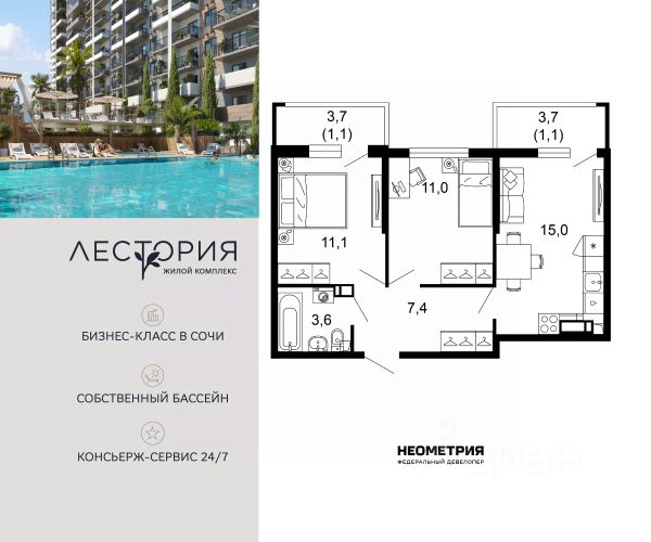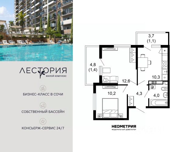 Продается квартира в жилом комплексе бизнес-класса "Лестория". В составе ЖК предусмотрена собственная аквазона площадью 473 квадратных метра с двумя подогреваемыми бассейнами, что соответствуют стандартам бизнес-класса. Аквазона объединяет взрослый и детский бассейны. В welcome-zone к услугам посетителей шезлонги и все необходимые принадлежности. Раздевалки с душевыми комнатами, инфракрасная сауна — здесь все предусмотрено для комфортного отдыха и полного расслабления. Для водного комплекса продуман отдельный вход, оборудованный системой контроля и управления доступом (СКУД). Аквазона только часть уникальной инфраструктуры "Лестории", которая включает в себя также благоустроенную территорию с пятьюдесятью функциональными зонами для прогулок, отдыха и занятий спортом, видовые террасы на крышах для отдыха, работы и встреч с друзьями, а также пространство набережной Кудепсты с шезлонгами и перголами. Жилой комплекс "Лестория" состоит из шести домов высотностью от 15 до 17 этажей, окружённых зеленым массивом национального парка. На придомовой территории для жителей предусмотрены закрытые дворы с круглосуточным видеонаблюдением, активити-центр для детей и подростков, тихие зоны для отдыха и медитации. На крышах домов будут созданы зеленые террасы для наслаждения прекрасными видами на море и горы. В проекте предусмотрены разные варианты отделки квартир под потребности покупателей. Тем, кто хочет воплотить в жизнь собственные интерьерные задумки, подойдут квартиры без ремонта. Для комфортной жизни и отдыха в комплексе будет работать круглосуточный консьерж-сервис уровня 5*, который с легкостью закроет все ежедневные потребности: от заказа продуктов и встречи гостей в аэропорту до выгула и дрессировки питомца. К услугам жителей ЖК "Лестория" — собственная управляющая компания, для инвесторов предоставляются услуги доверительного управления.