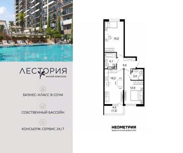 Продается квартира в жилом комплексе бизнес-класса "Лестория". В составе ЖК предусмотрена собственная аквазона площадью 473 квадратных метра с двумя подогреваемыми бассейнами, что соответствуют стандартам бизнес-класса. Аквазона объединяет взрослый и детский бассейны. В welcome-zone к услугам посетителей шезлонги и все необходимые принадлежности. Раздевалки с душевыми комнатами, инфракрасная сауна — здесь все предусмотрено для комфортного отдыха и полного расслабления. Для водного комплекса продуман отдельный вход, оборудованный системой контроля и управления доступом (СКУД). Аквазона только часть уникальной инфраструктуры "Лестории", которая включает в себя также благоустроенную территорию с пятьюдесятью функциональными зонами для прогулок, отдыха и занятий спортом, видовые террасы на крышах для отдыха, работы и встреч с друзьями, а также пространство набережной Кудепсты с шезлонгами и перголами. Жилой комплекс "Лестория" состоит из шести домов высотностью от 15 до 17 этажей, окружённых зеленым массивом национального парка. На придомовой территории для жителей предусмотрены закрытые дворы с круглосуточным видеонаблюдением, активити-центр для детей и подростков, тихие зоны для отдыха и медитации. На крышах домов будут созданы зеленые террасы для наслаждения прекрасными видами на море и горы. В проекте предусмотрены разные варианты отделки квартир под потребности покупателей. Тем, кто хочет воплотить в жизнь собственные интерьерные задумки, подойдут квартиры без ремонта. Для комфортной жизни и отдыха в комплексе будет работать круглосуточный консьерж-сервис уровня 5*, который с легкостью закроет все ежедневные потребности: от заказа продуктов и встречи гостей в аэропорту до выгула и дрессировки питомца. К услугам жителей ЖК "Лестория" — собственная управляющая компания, для инвесторов предоставляются услуги доверительного управления. #Z6AgvV