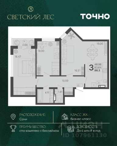 Квартира: 47,9м2 (с балконом 5,8м2)