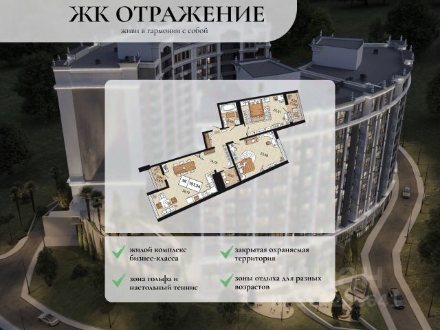 ЖК Отражение - это настоящий бизнес-класс в самом сердце города. Идеальный баланс трех ценностей: комфорта, безопасности и качества для гармоничной и спокойной жизни. Самое важное в шаговой доступности - поликлиники, сад, школа, кинотеатр, православный храм, огромное количество магазинов и аптек, отделение банка, салоны красоты, почта. Объект расположен внутри сложившегося микрорайона со всем необходимым. Донская респектабельный район, который сегодня переживает новый расцвет и обновляется. Насыщенная инфраструктура района становится только лучше и разнообразнее. Не вы подстраиваетесь под структуру, а она под вас - здесь времени хватит на все. С помощью развитой внутренней инфраструктуры создаётся пространство больших возможностей, самые необходимые товары и услуги - на расстоянии минутной поездки на лифте. В домах предусмотрена подземная парковка и зарядная станция для электрокаров. Закрытая охраняемая территория; вход в подъезд по Face-id; зона для работы и переговоров; зал для йоги и фитнеса; зона гольфа и настольный теннис; шахматный стол и мини-хоккей; амфитеатр, который в вечернее время будет функционировать как кинотеатр на свежем воздухе; территория с зонами для отдыха и детской игровой площадкой. Купить 3-комнатную квартиру элитные в Центральном районе Сочи городского округа.