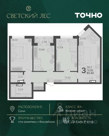 Светский лес - эксклюзивный жилой проект бизнес-класса в Сочи. Это остров цивилизации и технологий в окружении дикой природы национального парка с богатой инфраструктурой, наполненной различными сценариями премиального отдыха и жизни. Общественное пространство ЖК включает в себя прогулочные зоны, СПА комплекс с круглогодичным бассейном, детские и спортивные площадки, велодорожки, собственную набережную реки Сочи, торговую галерею с супермаркетами и ресторанами, а также инновационную школу и детский сад.