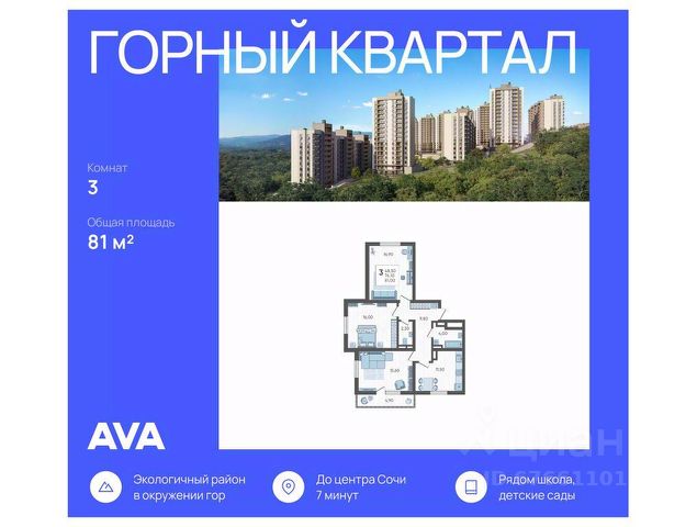 В продаже 3-комнатная квартира площадью 81, расположенная Литер 4 жилого комплекса комфорт+ класса "Горный квартал". Комплекс от девелопера AVA находится в Сочи, Хостинского района, в 15 минутах езды от центра города. Отличная транспортная доступность: Остановка маршрутных такси - 5 минут пешком, Барановский виадук - 10 минут на авто, Министерские озера - 2 минуты пешком, Гимназии, детские сады, фитнес-центры, супермаркеты, кинотеатр - 5-10 минут на авто, Ж/Д и автовокзал - 15-20 минут на авто, Адлер - 30 минут на авто, Аэропорт - 45 минут на авто. Аккуратный облик домов Жилой комплекс состоит из пяти корпусов высотой от 10 до 16 этажей. Сдержанные фасады в бежево-серых оттенках выглядят аккуратно и гармонируют с природным окружением, а открытые балконы добавляют облику домов легкости. Контейнеры под кондиционеры встроены в фасады и практически незаметны, благодаря чему дома сохраняют опрятный внешний вид. Комплекс расположен на склоне горы, поэтому из окон квартир на верхних этажах открываются отличные панорамные виды на лес, озеро и город: чем выше этаж, тем выразительнее пейзаж. Двор, где есть место для всех На внутренней территории комплекса всем будет приятно и интересно проводить время в любой сезон. Здесь есть беседки и гамаки под теневыми навесами, что особенно удобно для отдыха в жаркие или дождливые дни. Для активных жителей предусмотрены спортивные площадки и уличные тренажеры, для детей - игровые площадки из натуральных материалов, а для семей и компаний - зона барбекю. Особое преимущество - кинотеатр под открытым небом: формат редкий для жилых комплексов и особенно ценный для совместного семейного досуга прямо рядом с домом. Во всем дворе - ландшафтное озеленение: высажены разнообразные деревья и кустарники, южные цветы и газоны. Природное окружение и идеальная экология Локация особенно понравится тем, кто любит природу и ведет активный образ жизни. Всего в 2 минутах ходьбы находится Нижнее Министерское озеро - отличное место для прогулок и отдыха. Поблизости расположены природные достопримечательности южного побережья, включая Черепашье озеро и дольмены, куда интересно ходить в походы или выезжать на выходные. До общественных и санаторных пляжей можно добраться за 20 минут на автомобиле. Благодаря хвойному лесу и мягкому морскому бризу здесь всегда чистый воздух, а ночами видно звездное небо, что подчеркивает горный характер места и создает редкое ощущение тишины и уюта для Сочи. Дополнительные преимущества Видовые квартиры с окнами на три стороны света и семейные форматы с тремя спальнями, двумя ванными и отдельной кухней; Наземный паркинг для жителей и гостей на 815 машиномест, На первых этажах домов работают магазины, рестораны и салоны красоты, к которым можно спуститься на лифте, Комфортно не только отдыхать, но и полноценно жить всей семьей: гимназии в 10 минутах езды, удобная дорогая до города, магазины и сервисы поблизости.