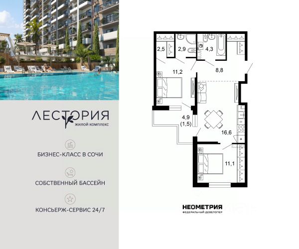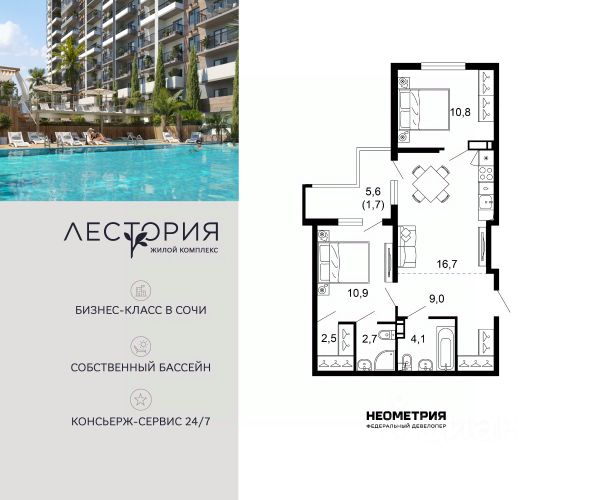 Продается квартира в жилом комплексе бизнес-класса "Лестория". В составе ЖК предусмотрена собственная аквазона площадью 473 квадратных метра с двумя подогреваемыми бассейнами, что соответствуют стандартам бизнес-класса. Аквазона объединяет взрослый и детский бассейны. В welcome-zone к услугам посетителей шезлонги и все необходимые принадлежности. Раздевалки с душевыми комнатами, инфракрасная сауна — здесь все предусмотрено для комфортного отдыха и полного расслабления. Для водного комплекса продуман отдельный вход, оборудованный системой контроля и управления доступом (СКУД). Аквазона только часть уникальной инфраструктуры "Лестории", которая включает в себя также благоустроенную территорию с пятьюдесятью функциональными зонами для прогулок, отдыха и занятий спортом, видовые террасы на крышах для отдыха, работы и встреч с друзьями, а также пространство набережной Кудепсты с шезлонгами и перголами. Жилой комплекс "Лестория" состоит из шести домов высотностью от 15 до 17 этажей, окружённых зеленым массивом национального парка. На придомовой территории для жителей предусмотрены закрытые дворы с круглосуточным видеонаблюдением, активити-центр для детей и подростков, тихие зоны для отдыха и медитации. На крышах домов будут созданы зеленые террасы для наслаждения прекрасными видами на море и горы. В проекте предусмотрены разные варианты отделки квартир под потребности покупателей. Тем, кто хочет воплотить в жизнь собственные интерьерные задумки, подойдут квартиры без ремонта. Для комфортной жизни и отдыха в комплексе будет работать круглосуточный консьерж-сервис уровня 5*, который с легкостью закроет все ежедневные потребности: от заказа продуктов и встречи гостей в аэропорту до выгула и дрессировки питомца. К услугам жителей ЖК "Лестория" — собственная управляющая компания, для инвесторов предоставляются услуги доверительного управления.