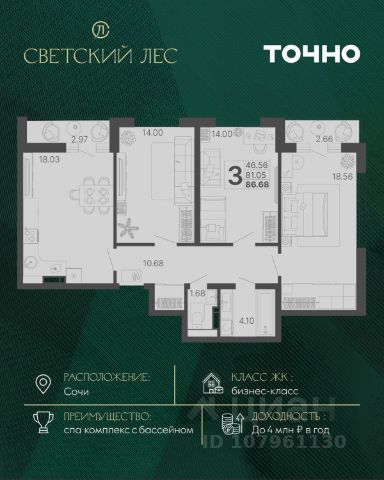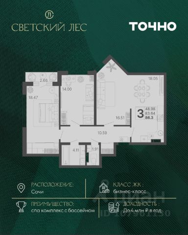 Добро пожаловать в "Grand Royal Residences" - уникальный, даже в масштабах России, комплекс апартаментов, расположенный на самой высокой точке Черноморской Ривьеры в центре Сочи. Пять монументальных корпусов бывшего санатория им. Кирова, приобретающих современный лоск. Решив выбрать нас в этот особый период, Вы сможете наслаждаться роскошью новейших апартаментов, при этом получив привлекательные цены, которые просто несравнимы с периодом официального открытия и полного запуска всего комплекса. Станьте частью новой истории, которую мы создаем прямо сейчас. Выберите апартамент для отдыха уже сегодня. Архитектурный ансамбль из пяти монументальных корпусов бывшего санатория им. Кирова построенный в 1936 году и воссозданный в современном стиле, сохраняет свою историческую ценность и официально признан памятником истории и культуры. Это место для тех, кто предпочитает классическую традицию сиюминутным капризам моды, не готов идти на компромиссы в вопросах комфорта и не нуждается в подтверждении своего статуса. Комплекс находится на закрытой парковой территории площадью 4 га, утопает в зелени тропических и субтропических растений. Уютные зеленые дворики в итальянском и японском стиле каждая деталь призвана подчеркнуть связь архитектуры с окружающим ландшафтом, где проект дизайна территории разрабатывали Arteza ведущая ландшафтная компания России. Grand Royal Residences для настоящих ценителей центра Сочи - всего в 5 минутах езды на автомобиле, расположены основные культурные и развлекательные заведения: парк отдыха "Ривьера", Морской порт, Художественный музей, Дендрологический парк, лучшие рестораны и бутики. 3-комнатная квартира в районе Центральный в городе Сочи.
