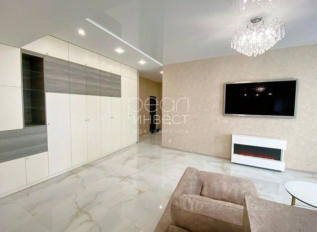 Качественная мебель и декор: диван, обеденный стол, люстры, телевизор на стене — всё продумано до мелочей.