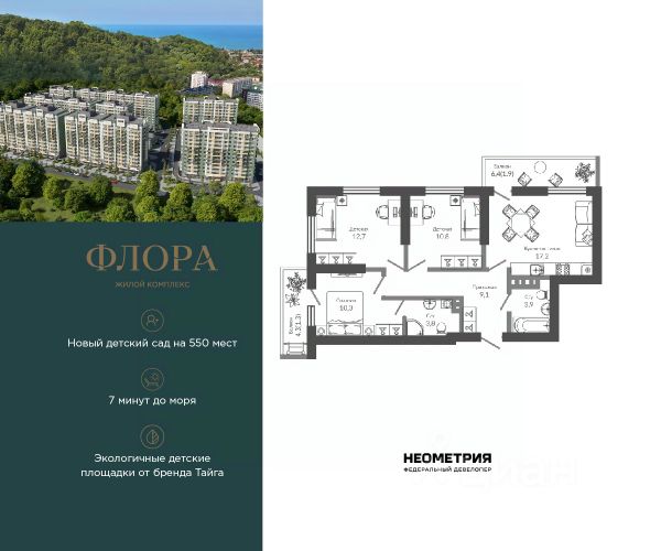 Современный проект, возведенный по технологии кирпично-монолитного строительства с комбинированными фасадами. Во входных группах выполнена дизайнерская отделка. В проекте представлено множество планировочных решений — от студий до 3х-комнатных квартир. Все лоты сдаются с чистовой отделкой, высотой потолков до 3 метров и увеличенными окнами. Территория комплекса благоустроена и закрыта от автомобилей — на крышах домов расположены 7 видовых террас, выполнено озеленение по дизайн-проекту российского бюро "SCAPE". Для автовладельцев предусмотрен подземный и многоуровневый наземный паркинг на 542 места. Жилой комплекс расположен в районе с хорошо развитой инфраструктурой — в пешей доступности имеется все необходимое: продовольственные магазины, аптеки, образовательные учреждения, медицинские центры, кафе и рестораны. Продается 3-комнатная квартира в новостройке в районе Адлерский в городе Сочи.