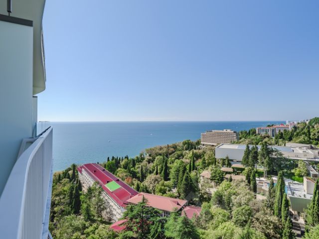 Лучшая планировка в комплексе, западная сторона, вид на хвойные вершины деревьев, море, город.