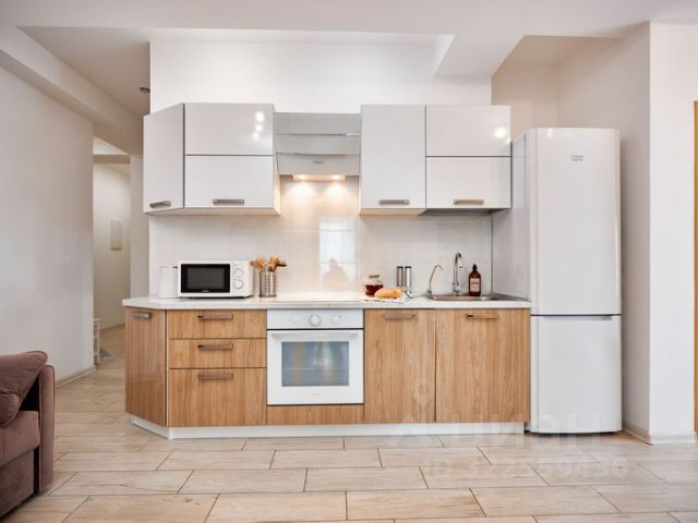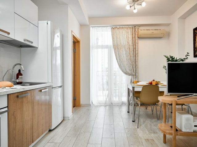 В квартире сделан дизайнерский ремонт, использованы качественные материалы. Комнаты полностью меблированы современной мебелью. На кухне установлена вся необходимая бытовая техника, включая духовой шкаф, варочную панель, холодильник и посудомоечную машину. Планировка удобная, с двумя балконами, что добавляет дополнительное пространство для отдыха. Санузел совмещенный, оборудован современной сантехникой.