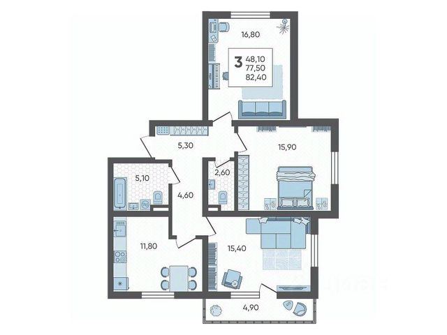 Видовые квартиры с окнами на три стороны света и семейные форматы с тремя спальнями, двумя ванными и отдельной кухней;