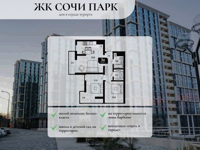 Проект включает в себя 9 домов бизнес-класса. Дома возводятся по долговечной монолитной технологии. Фасады облицованы вентилируемыми фасадами. Покупателям в ЖК предложено множество планировочных решений: в наличии квартиры, как классического типа, так и европланировки. Квартиры сдаются с подчистовой отделкой и высотой потолков 2,85 метров. На территории комплекса предусмотрена школа на 1100 мест. На первых этажах находятся коммерческие помещения. Для автовладельцев предусмотрены парковки. Территория комплекса благоустроена, Жилой комплекс расположен в микрорайоне Бытха города Сочи. Инфраструктура района развита: в пешей доступности детские сады, школы, аптеки и поликлиники, магазины и парки.