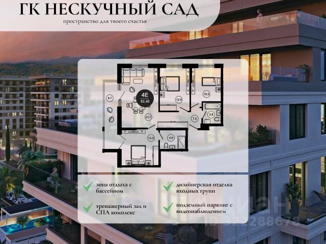 Нескучный сад Rsidences la mer — авторский курорт с атмосферой французской Ривьеры, где каждый день как увлекательное путешествие. Курортный комплекс Нескучный сад создан для тех, кто путешествует по миру в поисках идеального места, где можно замедлиться, ощутить жизнь всеми органами чувств, чувствовать заботу и премиальный сервис. Неометрия создала подобное пространство здесь — в сердце Сочи. Премиальный курорт имеет официальный статус пятизвездочного отеля, реализуется по ФЗ-214 с использованием эскроу-счетов. Состоит из многоуровневой приватной территории 4,5 га, пяти садов чувств, уникального парящего променада 1,3 га, ведущего к морю, и собственного концептуального пляжа. Камерная локация Курорт расположен в Адлерском районе Центрального Сочи, между морем и горами. Место выбрано не случайно и подчеркивает ценность замедления в центре динамичной жизни. Чтобы оградить вас от шума и суеты, Нескучный сад скрыт в объятиях реликтового парка. Находясь в сердце золотого треугольника Сочи - 10 минутах до международного аэропорта, 15 минутах до Олимпийского парка и 45 минутах до Горнолыжного курорта Роза Хутор и Красной Поляны, вы получаете долгожданную приватность и ощущение загородной жизни. Прогулка до собственного пляжа - 450 шагов незабываемых ощущений по уникальному парящему променаду между верхушек пицундских сосен и платанов. В вашем распоряжении инфраструктура собственного курорта Каждая деталь в Rsidences la mer продумана и настроена на волну удовольствий: пул концептуальных ресторанов, подогреваемые бассейны, два уровня wellness & SPA, детские плей хабы и развивающий центр, воркауты в окружении зелени и деловой-кластер делают Нескучный сад достойным выбором для самой взыскательной аудитории. Безукоризненный сервис пятизвездочного отеля Попадая в Нескучный сад, ощущаешь себя гостем фешенебельного отеля valet parking, cleaning Focus, деликатный консьерж-сервис освобождает от рутины, фрахтует яхты для морской прогулки, электронно регистрирует ваших гостей, рекомендует лучшие маршруты путешествий для знакомства с аутентичной культурой, локальной гастрономией, легендами и традициями Сочи, забронирует лучший столик в одном из ресторанов. Любимые блюда прямо в вашу резиденцию доставит flashbot робот. Личныи помощник предугадывает желания и заботится о том, чтобы вы отдыхали, а ваши активы росли. Купить 4-комнатную квартиру в районе Адлерский в городе Сочи.