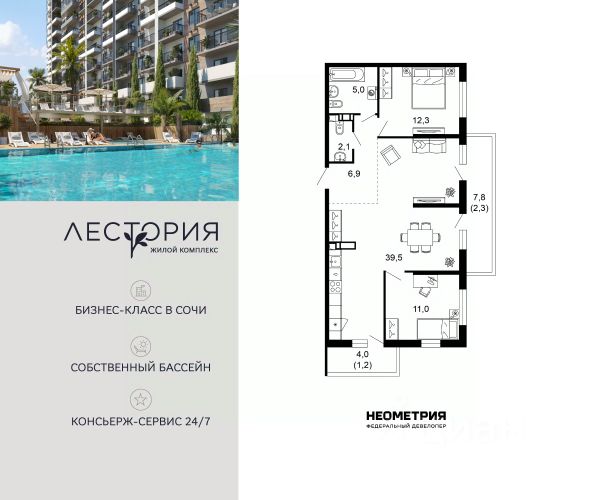 Продается квартира в жилом комплексе бизнес-класса "Лестория". В составе ЖК предусмотрена собственная аквазона площадью 473 квадратных метра с двумя подогреваемыми бассейнами, что соответствуют стандартам бизнес-класса. Аквазона объединяет взрослый и детский бассейны. В welcome-zone к услугам посетителей шезлонги и все необходимые принадлежности. Раздевалки с душевыми комнатами, инфракрасная сауна — здесь все предусмотрено для комфортного отдыха и полного расслабления. Для водного комплекса продуман отдельный вход, оборудованный системой контроля и управления доступом (СКУД). Аквазона только часть уникальной инфраструктуры "Лестории", которая включает в себя также благоустроенную территорию с пятьюдесятью функциональными зонами для прогулок, отдыха и занятий спортом, видовые террасы на крышах для отдыха, работы и встреч с друзьями, а также пространство набережной Кудепсты с шезлонгами и перголами. Жилой комплекс "Лестория" состоит из шести домов высотностью от 15 до 17 этажей, окружённых зеленым массивом национального парка. На придомовой территории для жителей предусмотрены закрытые дворы с круглосуточным видеонаблюдением, активити-центр для детей и подростков, тихие зоны для отдыха и медитации. На крышах домов будут созданы зеленые террасы для наслаждения прекрасными видами на море и горы. В проекте предусмотрены разные варианты отделки квартир под потребности покупателей. Тем, кто хочет воплотить в жизнь собственные интерьерные задумки, подойдут квартиры без ремонта. Для комфортной жизни и отдыха в комплексе будет работать круглосуточный консьерж-сервис уровня 5*, который с легкостью закроет все ежедневные потребности: от заказа продуктов и встречи гостей в аэропорту до выгула и дрессировки питомца. К услугам жителей ЖК "Лестория" — собственная управляющая компания, для инвесторов предоставляются услуги доверительного управления.