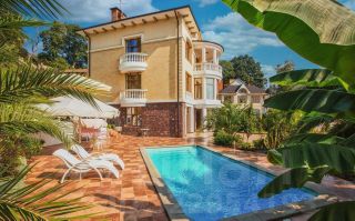 Вилле, с которой мы рекомендуем познакомиться, сложно найти конкурентов. Это поместье, расположившееся в микрорайоне Мамайка, в центральной части Сочи удивляет своим размахом и претенциозностью. В роскошном здании, занимающем три этажа общей площадью 1200 кв. м, трудно найти то, чего не хватает для роскошной жизни. Здесь можно проводить многолюдные праздники и найти условия для полного уединения. Для разного рода мероприятий идеально подойдет огромный зал. Кухня, расположенная в цокольном этаже, готова обслужить любое количество гостей, доставляя приготовленные блюда с помощью специального лифта. В доме предусмотрены помещения для хозяев, гостей и обслуживающего персонала. Есть банный комплекс и бильярдная. Отдельной похвалы заслуживают обустроенные террасы, позволяющие наслаждаться красотами моря. Между этажами функционирует пассажирский лифт. Дизайн помещений создан в классическом стиле, что во все времена является преимуществом. Мебель подобрана с отличным вкусом. Ее качество не вызывает никаких сомнений. Территория возле виллы Возле дома на территории в 30 соток вы найдете: три бассейна, один из которых детский; собственный пляж; теннисный корт. Контрольный пункт при въезде на территорию виллы снабжен системой связи и сигнализацией.