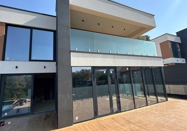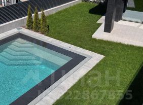Участок включает площадку для нескольких машин, террасу для отдыха, барбекю, душевую, есть открытый бассейн. По всей территории выполнено озеленение с автоматическим поливом, ночная подсветка клумб и фасада.