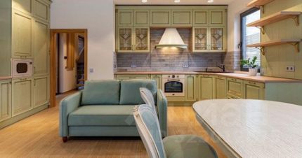 Кухня укомплектована. Есть посудомойка, микроволновка, духовка, газовая плита, холодильник, стиральная машинка.