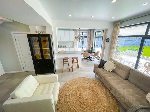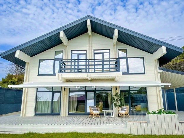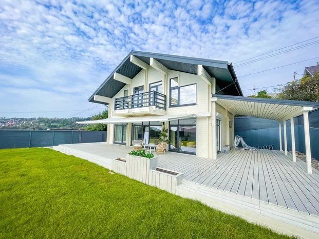 Общая площадь дома — 150 м². Рациональная планировка включает 5 жилых комнат, просторную кухню-гостиную, два санузла, а также мансардный этаж, где оборудована дополнительная спальня. Есть терраса, оборудованная под летнюю кухню, и собственная сауна — отличное решение для отдыха и приёма гостей.