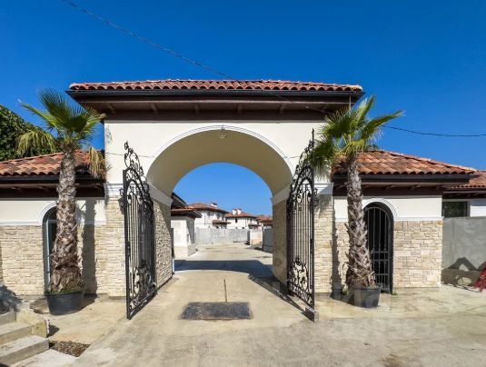 На территории в 5 соток выполнен полный ландшафтный дизайн, высажены пальмы вашингтонии, магнолия, олеандр, цикас, а также по опорной стене вьется трахелосперум. Место для отдыха на террасе с мебелью и уличным обогревателем для прохладных вечерних дней.