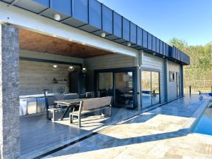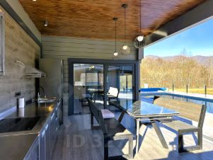 Общая площадь дома — 150 м². Рациональная планировка включает 5 жилых комнат, просторную кухню-гостиную, два санузла, а также мансардный этаж, где оборудована дополнительная спальня. Есть терраса, оборудованная под летнюю кухню, и собственная сауна — отличное решение для отдыха и приёма гостей.