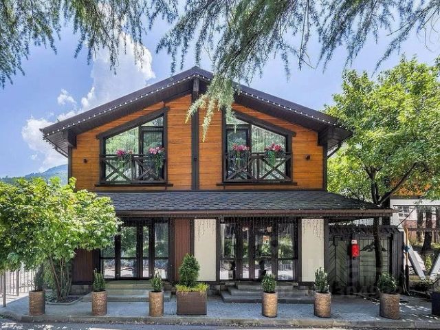 Участок включает гараж для нескольких машин, беседку и террасы для отдыха, мангальную, душевую, баньку, есть открытый бассейн. По всей территории выполнено озеленение с автоматическим поливом, ночная подсветка клумб и фасада.