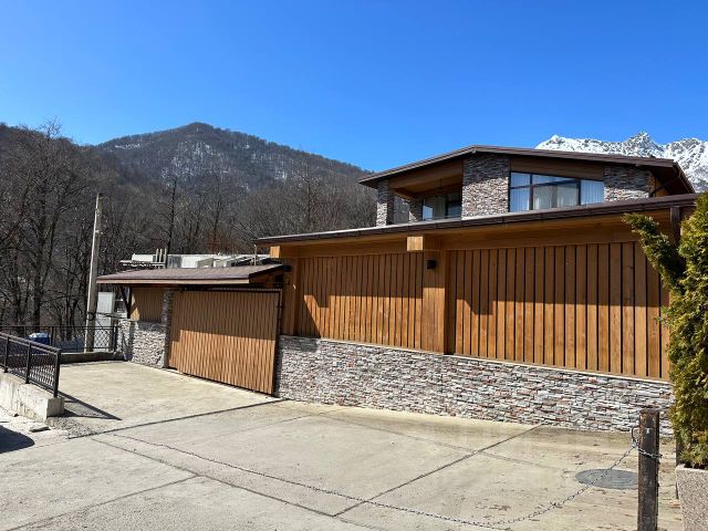 Участок благоустроен: брусчатка, озеленение, уличное освещение. Крытая летняя терраса с бассейном (6,43,3 м), керамогранит, лиственница, ангарская сосна, ротанговая мебель, уличный санузел с душевой. Летняя кухня с мангалом. Бассейн с подогревом, противотоком, дезинфекцией, автодоливом, цветным LED. Фундамент монолитная плита 300 мм, стены керамзитобетон с утеплителем. Фасад камень, карельская сосна, алюминиевые окна/двери, мягкая черепица. На 1 этаже прихожая, гардероб, санузел, гостиная, кухня, спальня, терраса. На 2 этаже 4 спальни, 2 душевые, балкон. В отделке дерево, ламинат, шпонированные плинтусы, теплый пол, конвекторы, кондиционеры, газ. Полностью оснащён встроенной техникой и мебелью. Продается дом на улице Ачишховская в поселке городского типа Красная Поляна в городе Сочи.