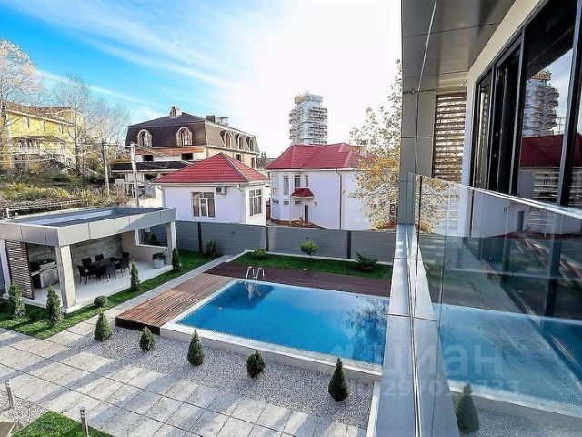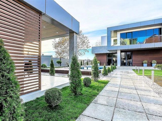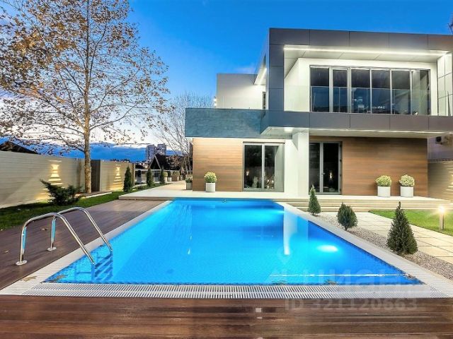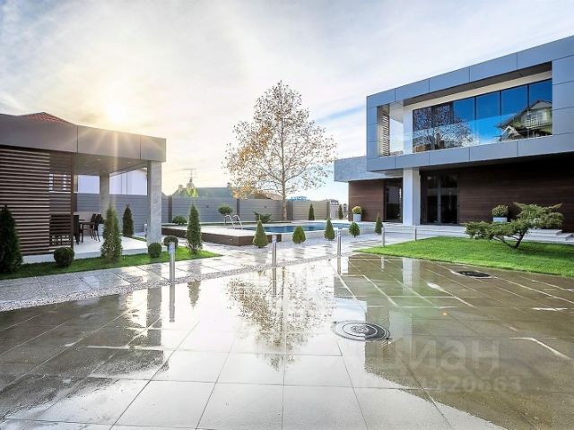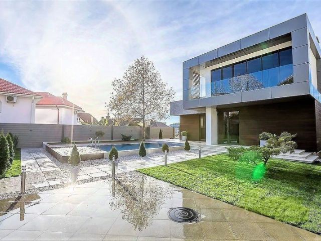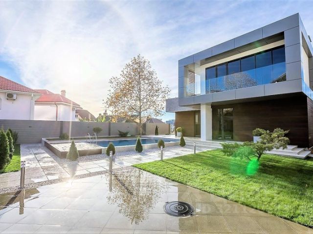 Дом выполнен по проекту известного архитектора, в современном стиле, на участке площадью 8 соток, декоративная подсветка, в отделке используется дорогие отделочные материалы: натуральный камень, керамогранит, декоративная штукатурка, стекло, экзотическое дерево; окна и проемы алюминиевый профиль с эксклюзивным покрытием, солнцезащитное остекление, по периметру террас и балконов безрамочное панорамное остекление. Во дворе переливной подогреваемый бассейн размером 7х4 м с противотоком, системой ультрафиолетовой и химической обработки воды, беседка в стиле дома, укомплектованная грилем, мебелью и всеми коммуникациями