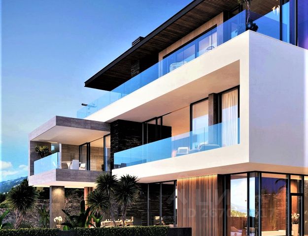 Современная архитектура дома с изящным наполнением и грамотной планировкой. Великолепное архитектурное решение исполнено в самых лучших традициях хай-тека, который характеризуется строгой геометрией фасадных линий, большой площадью витражного остекления. Прекрасным дополнением к архитектуре служит красивый ландшафтный дизайн прилегающей к дому территории. Участок украшен пальмами, рододендронами, олеандрами.