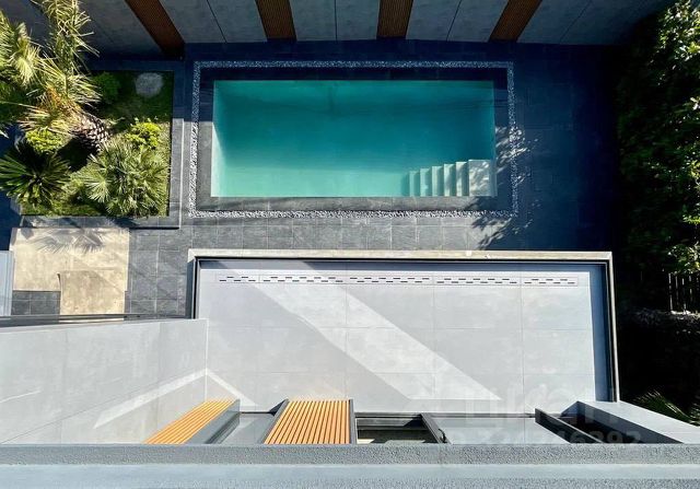 На территории большая парковка на четыре машины, бассейн каркасный 3/6