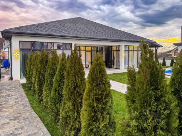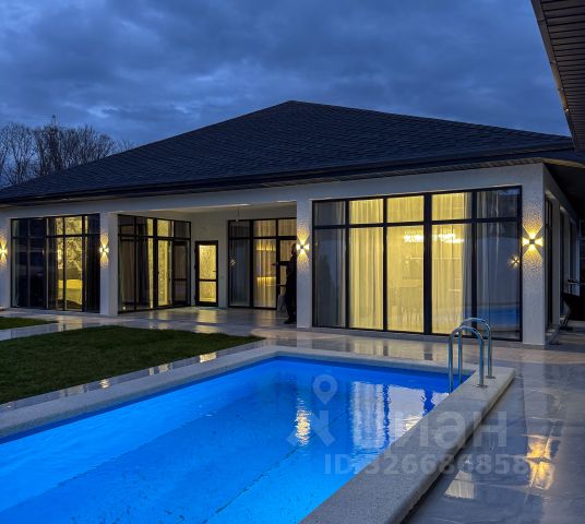 1-й этаж: кухня-гостиная с выходом к бассейну с подогревом, подсветкой и искусственным течением, санузел с душем и выходом к бассейну, сауна с отделкой канадским кедром и гималайской солью, спилом можжевельника, гардеробная, котельная, теплый пол по периметру.