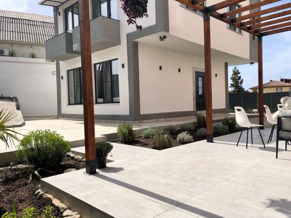 Автомат ворота, парковка на 2-3 машины, забор из ламелей.