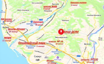 Дом находится рядом с новой асфальтированной подъездной дорогой. В 100 метрах расположен магазин "Пятерочка", а в 500 метрах — "Магнит". До федеральной трассы "Адлер-Красная Поляна" — 3,1 километра. До Красной Поляны около 40 километров, что составляет примерно 3035 минут на автомобиле по новой объездной дороге. До аэропорта Сочи (AER) — 11 километров, что занимает около 15 минут на машине. Олимпийский Парк находится в 5 километрах, а центр Адлера — в 13 километрах. Море и пляжи расположены в 6 километрах, рядом с Сириусом и Сочи Парком. В пешей доступности находится церковь.