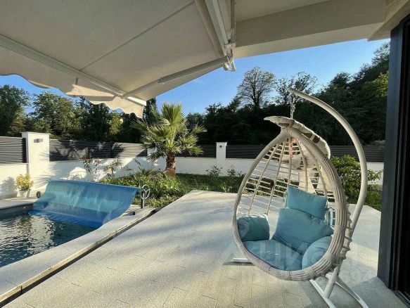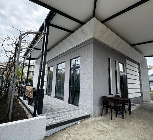 В доме два разных входа, с задней стороны вход в отдельную студию 30 квм с кухней и с/у(можно разместить родителей или сдавать в аренду), а с главной стороны вход в основную часть дома, 2 этажа: