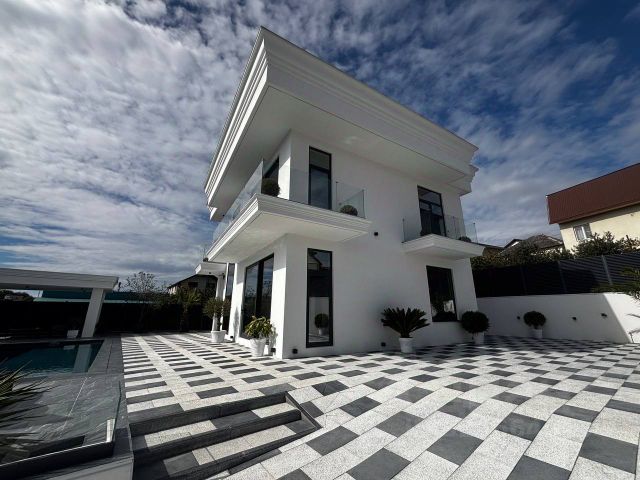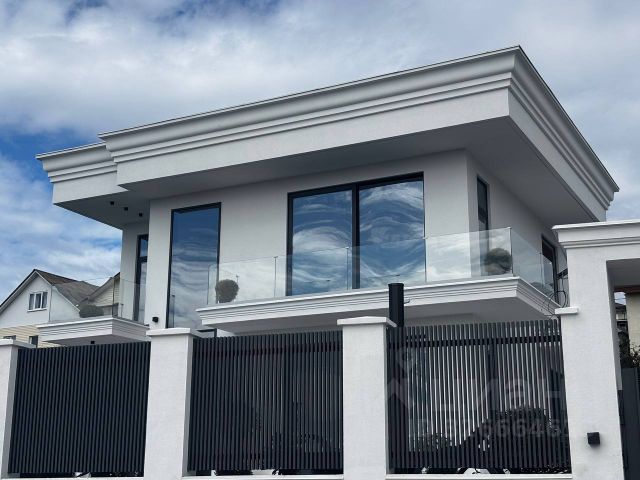На изображении представлена вилла в коттеджном поселке премиум-класса Modern Villas. Дом выполнен в современном стиле с элементами минимализма. Вилла имеет просторную площадь и высокие потолки, что создает ощущение простора и свободы. Участок земли вокруг дома аккуратно обустроен, имеется парковка для автомобилей. На территории поселка есть охраняемая зона с видеонаблюдением, что обеспечивает безопасность жителей. Также стоит отметить наличие бассейна и сауны на участке, которые станут отличным местом для отдыха и релаксации. Отделка виллы выполнена качественными материалами, включая итальянский керамогранит и немецкий алюминиевый профиль. Купить коттедж с участком 6 соток в селе Молдовка Краснодарского края.