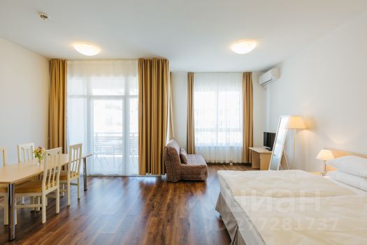 Резиденция с балконом, а также одним санузлом. Из окон открывается вид во внутренний двор, на бассейны и парки. Высота потолков составляет 3,1 метра. Отделка под ключ