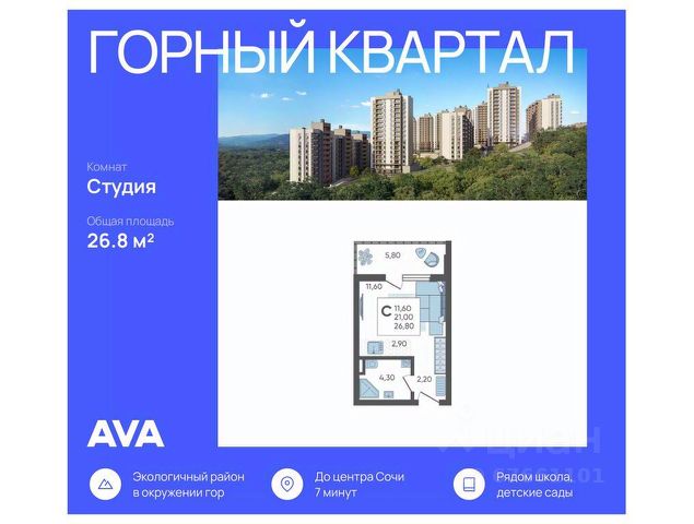 В продаже студия площадью 26.8, расположенная Литер 4 жилого комплекса комфорт+ класса "Горный квартал". Комплекс от девелопера AVA находится в Сочи, Хостинского района, в 15 минутах езды от центра города. Отличная транспортная доступность: Остановка маршрутных такси - 5 минут пешком, Барановский виадук - 10 минут на авто, Министерские озера - 2 минуты пешком, Гимназии, детские сады, фитнес-центры, супермаркеты, кинотеатр - 5-10 минут на авто, Ж/Д и автовокзал - 15-20 минут на авто, Адлер - 30 минут на авто, Аэропорт - 45 минут на авто. Аккуратный облик домов Жилой комплекс состоит из пяти корпусов высотой от 10 до 16 этажей. Сдержанные фасады в бежево-серых оттенках выглядят аккуратно и гармонируют с природным окружением, а открытые балконы добавляют облику домов легкости. Контейнеры под кондиционеры встроены в фасады и практически незаметны, благодаря чему дома сохраняют опрятный внешний вид. Комплекс расположен на склоне горы, поэтому из окон квартир на верхних этажах открываются отличные панорамные виды на лес, озеро и город: чем выше этаж, тем выразительнее пейзаж. Двор, где есть место для всех На внутренней территории комплекса всем будет приятно и интересно проводить время в любой сезон. Здесь есть беседки и гамаки под теневыми навесами, что особенно удобно для отдыха в жаркие или дождливые дни. Для активных жителей предусмотрены спортивные площадки и уличные тренажеры, для детей - игровые площадки из натуральных материалов, а для семей и компаний - зона барбекю. Особое преимущество - кинотеатр под открытым небом: формат редкий для жилых комплексов и особенно ценный для совместного семейного досуга прямо рядом с домом. Во всем дворе - ландшафтное озеленение: высажены разнообразные деревья и кустарники, южные цветы и газоны. Природное окружение и идеальная экология Локация особенно понравится тем, кто любит природу и ведет активный образ жизни. Всего в 2 минутах ходьбы находится Нижнее Министерское озеро - отличное место для прогулок и отдыха. Поблизости расположены природные достопримечательности южного побережья, включая Черепашье озеро и дольмены, куда интересно ходить в походы или выезжать на выходные. До общественных и санаторных пляжей можно добраться за 20 минут на автомобиле. Благодаря хвойному лесу и мягкому морскому бризу здесь всегда чистый воздух, а ночами видно звездное небо, что подчеркивает горный характер места и создает редкое ощущение тишины и уюта для Сочи. Дополнительные преимущества Видовые квартиры с окнами на три стороны света и семейные форматы с тремя спальнями, двумя ванными и отдельной кухней; Наземный паркинг для жителей и гостей на 815 машиномест, На первых этажах домов работают магазины, рестораны и салоны красоты, к которым можно спуститься на лифте, Комфортно не только отдыхать, но и полноценно жить всей семьей: гимназии в 10 минутах езды, удобная дорогая до города, магазины и сервисы поблизости.