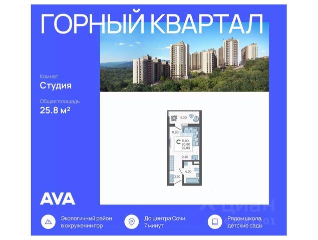 В продаже 3-комнатная квартира площадью 82.4, расположенная Литер 1 жилого комплекса комфорт+ класса "Горный квартал". Комплекс от девелопера AVA находится в Сочи, Хостинского района, в 15 минутах езды от центра города. Отличная транспортная доступность: Остановка маршрутных такси - 5 минут пешком, Барановский виадук - 10 минут на авто, Министерские озера - 2 минуты пешком, Гимназии, детские сады, фитнес-центры, супермаркеты, кинотеатр - 5-10 минут на авто, Ж/Д и автовокзал - 15-20 минут на авто, Адлер - 30 минут на авто, Аэропорт - 45 минут на авто. Аккуратный облик домов Жилой комплекс состоит из пяти корпусов высотой от 10 до 16 этажей. Сдержанные фасады в бежево-серых оттенках выглядят аккуратно и гармонируют с природным окружением, а открытые балконы добавляют облику домов легкости. Контейнеры под кондиционеры встроены в фасады и практически незаметны, благодаря чему дома сохраняют опрятный внешний вид. Комплекс расположен на склоне горы, поэтому из окон квартир на верхних этажах открываются отличные панорамные виды на лес, озеро и город: чем выше этаж, тем выразительнее пейзаж. Двор, где есть место для всех На внутренней территории комплекса всем будет приятно и интересно проводить время в любой сезон. Здесь есть беседки и гамаки под теневыми навесами, что особенно удобно для отдыха в жаркие или дождливые дни. Для активных жителей предусмотрены спортивные площадки и уличные тренажеры, для детей - игровые площадки из натуральных материалов, а для семей и компаний - зона барбекю. Особое преимущество - кинотеатр под открытым небом: формат редкий для жилых комплексов и особенно ценный для совместного семейного досуга прямо рядом с домом. Во всем дворе - ландшафтное озеленение: высажены разнообразные деревья и кустарники, южные цветы и газоны. Природное окружение и идеальная экология Локация особенно понравится тем, кто любит природу и ведет активный образ жизни. Всего в 2 минутах ходьбы находится Нижнее Министерское озеро - отличное место для прогулок и отдыха. Поблизости расположены природные достопримечательности южного побережья, включая Черепашье озеро и дольмены, куда интересно ходить в походы или выезжать на выходные. До общественных и санаторных пляжей можно добраться за 20 минут на автомобиле. Благодаря хвойному лесу и мягкому морскому бризу здесь всегда чистый воздух, а ночами видно звездное небо, что подчеркивает горный характер места и создает редкое ощущение тишины и уюта для Сочи. Дополнительные преимущества Видовые квартиры с окнами на три стороны света и семейные форматы с тремя спальнями, двумя ванными и отдельной кухней; Наземный паркинг для жителей и гостей на 815 машиномест, На первых этажах домов работают магазины, рестораны и салоны красоты, к которым можно спуститься на лифте, Комфортно не только отдыхать, но и полноценно жить всей семьей: гимназии в 10 минутах езды, удобная дорогая до города, магазины и сервисы поблизости.
