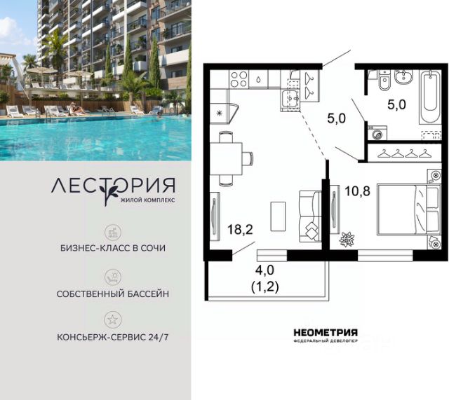 Продается квартира в жилом комплексе бизнес-класса "Лестория". В составе ЖК предусмотрена собственная аквазона площадью 473 квадратных метра с двумя подогреваемыми бассейнами, что соответствуют стандартам бизнес-класса. Аквазона объединяет взрослый и детский бассейны. В welcome-zone к услугам посетителей шезлонги и все необходимые принадлежности. Раздевалки с душевыми комнатами, инфракрасная сауна — здесь все предусмотрено для комфортного отдыха и полного расслабления. Для водного комплекса продуман отдельный вход, оборудованный системой контроля и управления доступом (СКУД). Аквазона только часть уникальной инфраструктуры "Лестории", которая включает в себя также благоустроенную территорию с пятьюдесятью функциональными зонами для прогулок, отдыха и занятий спортом, видовые террасы на крышах для отдыха, работы и встреч с друзьями, а также пространство набережной Кудепсты с шезлонгами и перголами. Жилой комплекс "Лестория" состоит из шести домов высотностью от 15 до 17 этажей, окружённых зеленым массивом национального парка. На придомовой территории для жителей предусмотрены закрытые дворы с круглосуточным видеонаблюдением, активити-центр для детей и подростков, тихие зоны для отдыха и медитации. На крышах домов будут созданы зеленые террасы для наслаждения прекрасными видами на море и горы. В проекте предусмотрены разные варианты отделки квартир под потребности покупателей. Тем, кто хочет воплотить в жизнь собственные интерьерные задумки, подойдут квартиры без ремонта. Для комфортной жизни и отдыха в комплексе будет работать круглосуточный консьерж-сервис уровня 5*, который с легкостью закроет все ежедневные потребности: от заказа продуктов и встречи гостей в аэропорту до выгула и дрессировки питомца. К услугам жителей ЖК "Лестория" — собственная управляющая компания, для инвесторов предоставляются услуги доверительного управления. #zToWbt