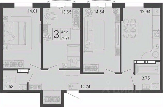 - *Возможность сделать 3 спальни* — например, перенесите стену или используйте часть гостиной как третью комнату