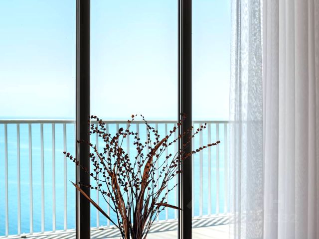 Лучшая планировка в комплексе, западная сторона, вид на хвойные вершины деревьев, море, город.