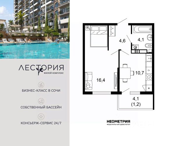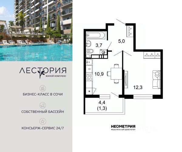 Продается квартира в жилом комплексе бизнес-класса "Лестория". В составе ЖК предусмотрена собственная аквазона площадью 473 квадратных метра с двумя подогреваемыми бассейнами, что соответствуют стандартам бизнес-класса.
