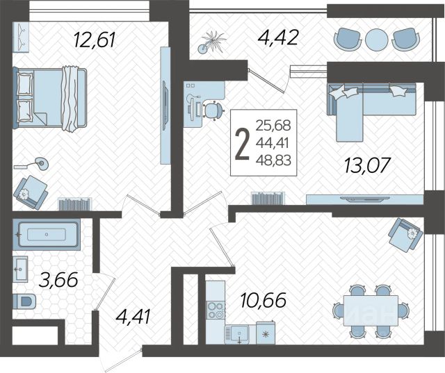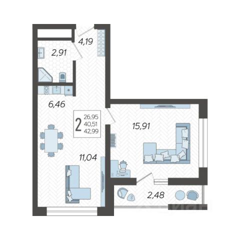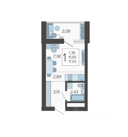 -Две отдельные комнаты, кухня совмещена с гостиной. Имеется санузел с ванной.