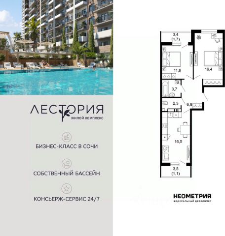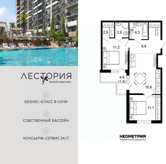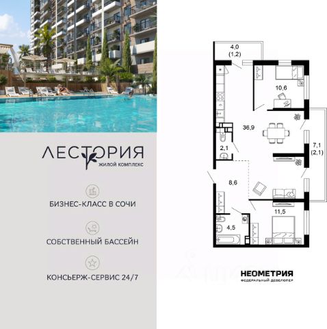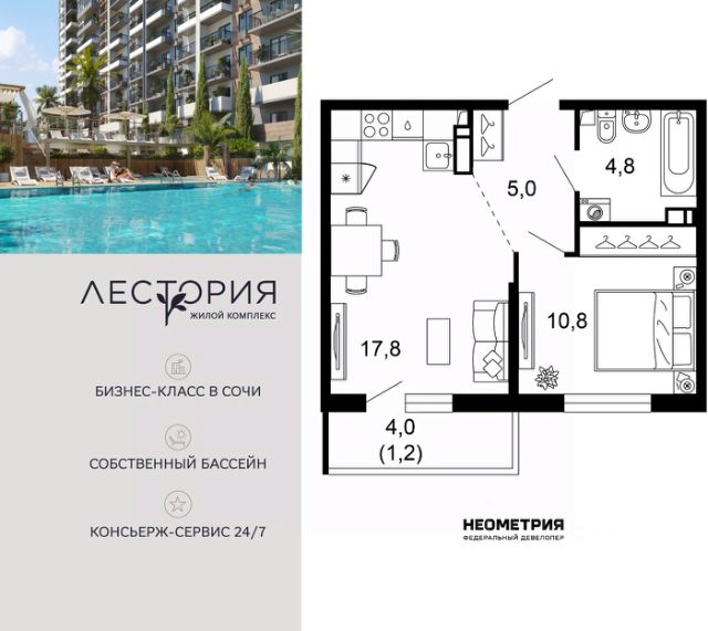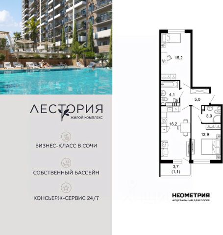 Продается квартира в жилом комплексе бизнес-класса "Лестория". В составе ЖК предусмотрена собственная аквазона площадью 473 квадратных метра с двумя подогреваемыми бассейнами, что соответствуют стандартам бизнес-класса. Аквазона объединяет взрослый и детский бассейны. В welcome-zone к услугам посетителей шезлонги и все необходимые принадлежности. Раздевалки с душевыми комнатами, инфракрасная сауна — здесь все предусмотрено для комфортного отдыха и полного расслабления. Для водного комплекса продуман отдельный вход, оборудованный системой контроля и управления доступом (СКУД). Аквазона только часть уникальной инфраструктуры "Лестории", которая включает в себя также благоустроенную территорию с пятьюдесятью функциональными зонами для прогулок, отдыха и занятий спортом, видовые террасы на крышах для отдыха, работы и встреч с друзьями, а также пространство набережной Кудепсты с шезлонгами и перголами. Жилой комплекс "Лестория" состоит из шести домов высотностью от 15 до 17 этажей, окружённых зеленым массивом национального парка. На придомовой территории для жителей предусмотрены закрытые дворы с круглосуточным видеонаблюдением, активити-центр для детей и подростков, тихие зоны для отдыха и медитации. На крышах домов будут созданы зеленые террасы для наслаждения прекрасными видами на море и горы. В проекте предусмотрены разные варианты отделки квартир под потребности покупателей. Тем, кто хочет воплотить в жизнь собственные интерьерные задумки, подойдут квартиры без ремонта. Для комфортной жизни и отдыха в комплексе будет работать круглосуточный консьерж-сервис уровня 5*, который с легкостью закроет все ежедневные потребности: от заказа продуктов и встречи гостей в аэропорту до выгула и дрессировки питомца. К услугам жителей ЖК "Лестория" — собственная управляющая компания, для инвесторов предоставляются услуги доверительного управления. #ZtOFZC