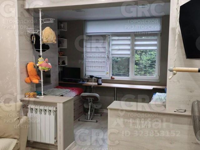 Просторная гостиная объединена с лоджией. Здесь установлен диван Askona (полноценное спальное место), большой шкаф для одежды, ТВ-тумба с ящиками, шкаф-стеллаж и сервант. На лоджии — дополнительный шкаф и место для организации рабочего кабинета или зоны отдыха. В комнате установлен кондиционер.