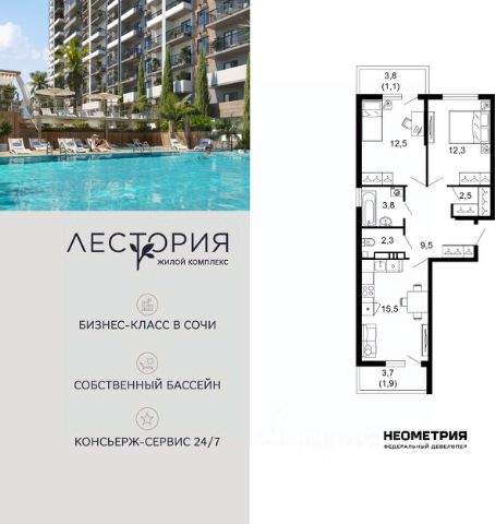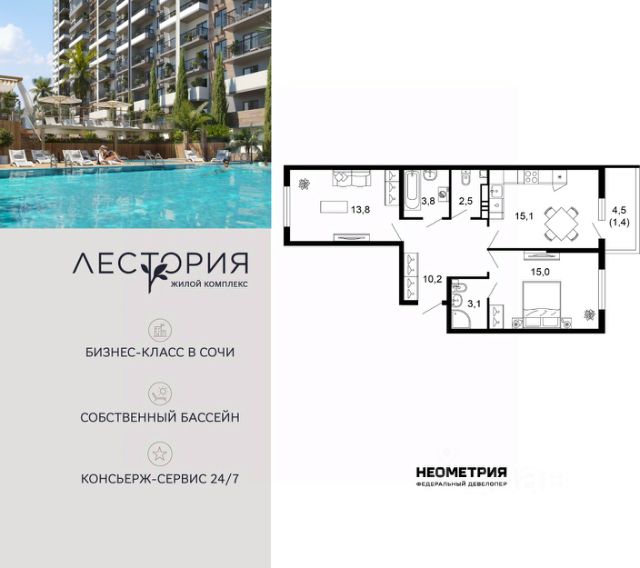 Продается квартира в жилом комплексе бизнес-класса "Лестория". В составе ЖК предусмотрена собственная аквазона площадью 473 квадратных метра с двумя подогреваемыми бассейнами, что соответствуют стандартам бизнес-класса. Аквазона объединяет взрослый и детский бассейны. В welcome-zone к услугам посетителей шезлонги и все необходимые принадлежности. Раздевалки с душевыми комнатами, инфракрасная сауна — здесь все предусмотрено для комфортного отдыха и полного расслабления. Для водного комплекса продуман отдельный вход, оборудованный системой контроля и управления доступом (СКУД). Аквазона только часть уникальной инфраструктуры "Лестории", которая включает в себя также благоустроенную территорию с пятьюдесятью функциональными зонами для прогулок, отдыха и занятий спортом, видовые террасы на крышах для отдыха, работы и встреч с друзьями, а также пространство набережной Кудепсты с шезлонгами и перголами. Жилой комплекс "Лестория" состоит из шести домов высотностью от 15 до 17 этажей, окружённых зеленым массивом национального парка. На придомовой территории для жителей предусмотрены закрытые дворы с круглосуточным видеонаблюдением, активити-центр для детей и подростков, тихие зоны для отдыха и медитации. На крышах домов будут созданы зеленые террасы для наслаждения прекрасными видами на море и горы. В проекте предусмотрены разные варианты отделки квартир под потребности покупателей. Тем, кто хочет воплотить в жизнь собственные интерьерные задумки, подойдут квартиры без ремонта. Для комфортной жизни и отдыха в комплексе будет работать круглосуточный консьерж-сервис уровня 5*, который с легкостью закроет все ежедневные потребности: от заказа продуктов и встречи гостей в аэропорту до выгула и дрессировки питомца. К услугам жителей ЖК "Лестория" — собственная управляющая компания, для инвесторов предоставляются услуги доверительного управления. #Z6D0Fc